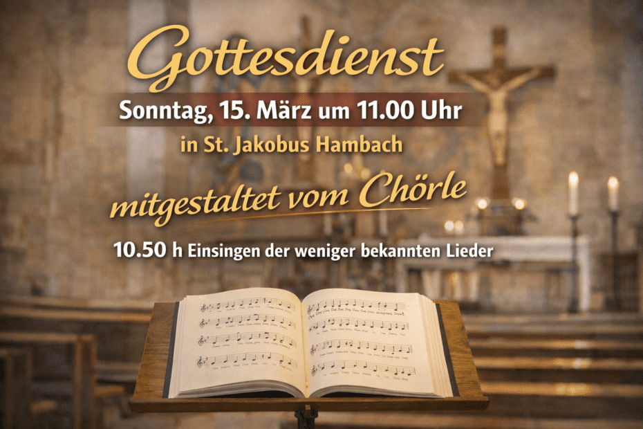 Ganz herzliche Einladung für Sonntag, 15. März 2026, um 11 Uhr in St. Jakobus, Hambach, zum Gottesdienst, in dem wir ausschließlich aus dem Jungen Gotteslob „Ein Segen sein“ singen werden. Die Chörle-Sängerinnen werden wie immer bei NGL-Godis mit im Kirchenschiff sitzen und so den Gemeindegesang unterstützen. Zwei eventuell weniger bekannte Lieder stellen wir wieder etwa zehn Minuten vor dem Gottesdienst vor; wer es also einrichten kann, sei bitte schon um 10.50 Uhr in der Kirche. Die Liederbücher „Ein Segen sein“ liegen aus. In Vorfreude und im Namen aller Chörle-Sängerinnen grüßt Sie und Euch herzlich das Chörle-Orga-Team.
